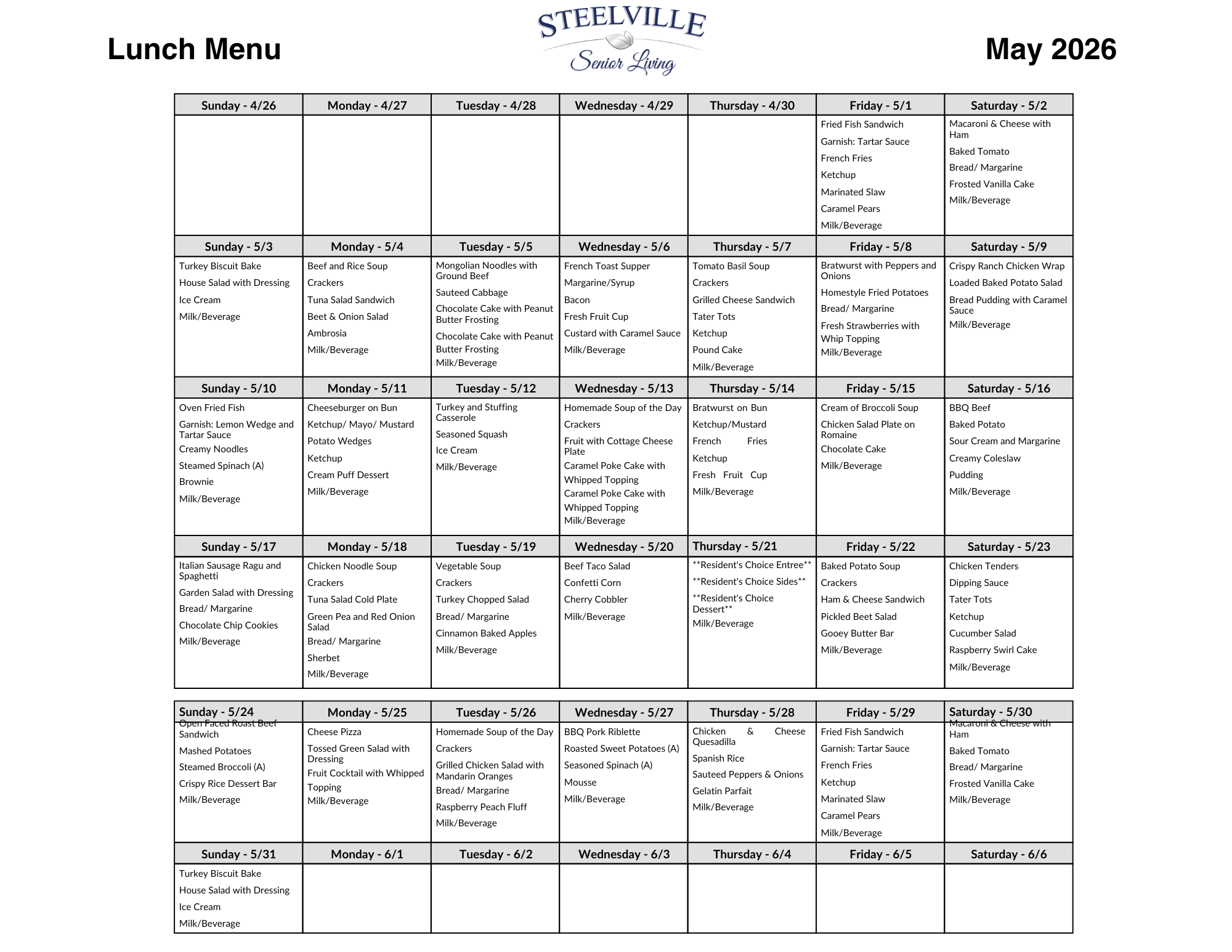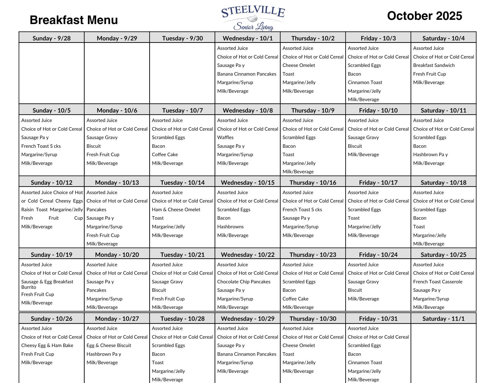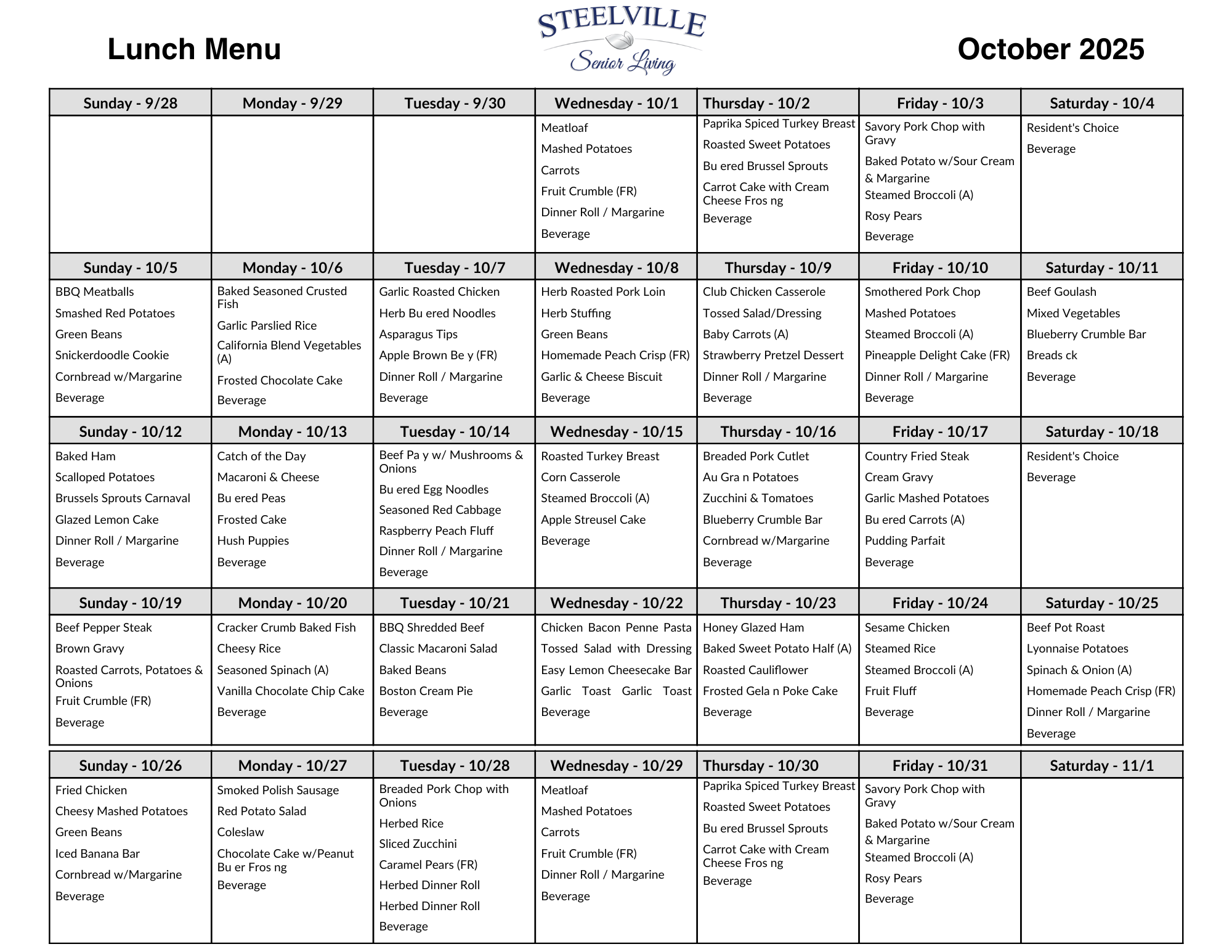 We offer an exceptional dining experience with restaurant-style service and menus, including specials served daily. The culinary team creates a variety of delicious, nutritious meals using fresh ingredients, catering to diverse tastes and dietary needs. Residents can enjoy meals in a warm and welcoming dining room that fosters a sense of community and social connection. The attentive staff ensures a pleasant dining experience, accommodating individual preferences and providing a personalized touch. With a flexible ala carte menu that changes regularly, Steelville Senior Living provides residents with a delightful and enjoyable dining experience every day. Registered Dietitians work with our professional dietary and nursing team to achieve the highest possible nutritional status of our residents. Also, Registered Dietitians provide nutritional education for our employees, resident and families.